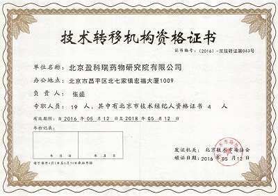 近日,北京盈科瑞藥物研究院有限公司通過(guò)北京技術(shù)市場(chǎng)協(xié)會(huì)審核,獲得“技術(shù)轉(zhuǎn)移機(jī)構(gòu)資格證書(shū)”,標(biāo)志著北京盈科瑞在技術(shù)轉(zhuǎn)移、科技成果轉(zhuǎn)化領(lǐng)域又邁進(jìn)了一大步。
