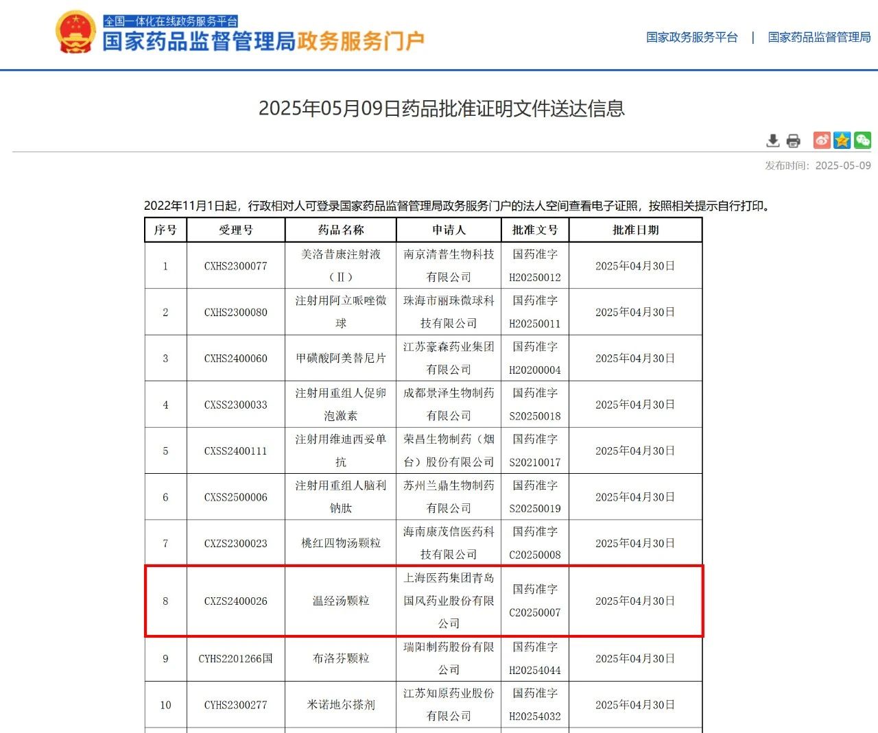 斗指東南,萬物繁茂,2025年4月30日,由盈科瑞研究開發(fā),上海醫(yī)藥集團(tuán)青島國風(fēng)藥業(yè)股份有限公司持有的中藥3.1類新藥溫經(jīng)湯顆粒獲批上市,此為由盈科瑞研發(fā)成功上市的第7個經(jīng)典名方復(fù)方制劑。目前,國家藥監(jiān)局共簽發(fā)3.1類經(jīng)典名方復(fù)方制劑19個注冊批件,其中盈科瑞研發(fā)占7件,充分體現(xiàn)了盈科瑞在經(jīng)典名方領(lǐng)域的研發(fā)實(shí)力和經(jīng)驗(yàn)優(yōu)勢。