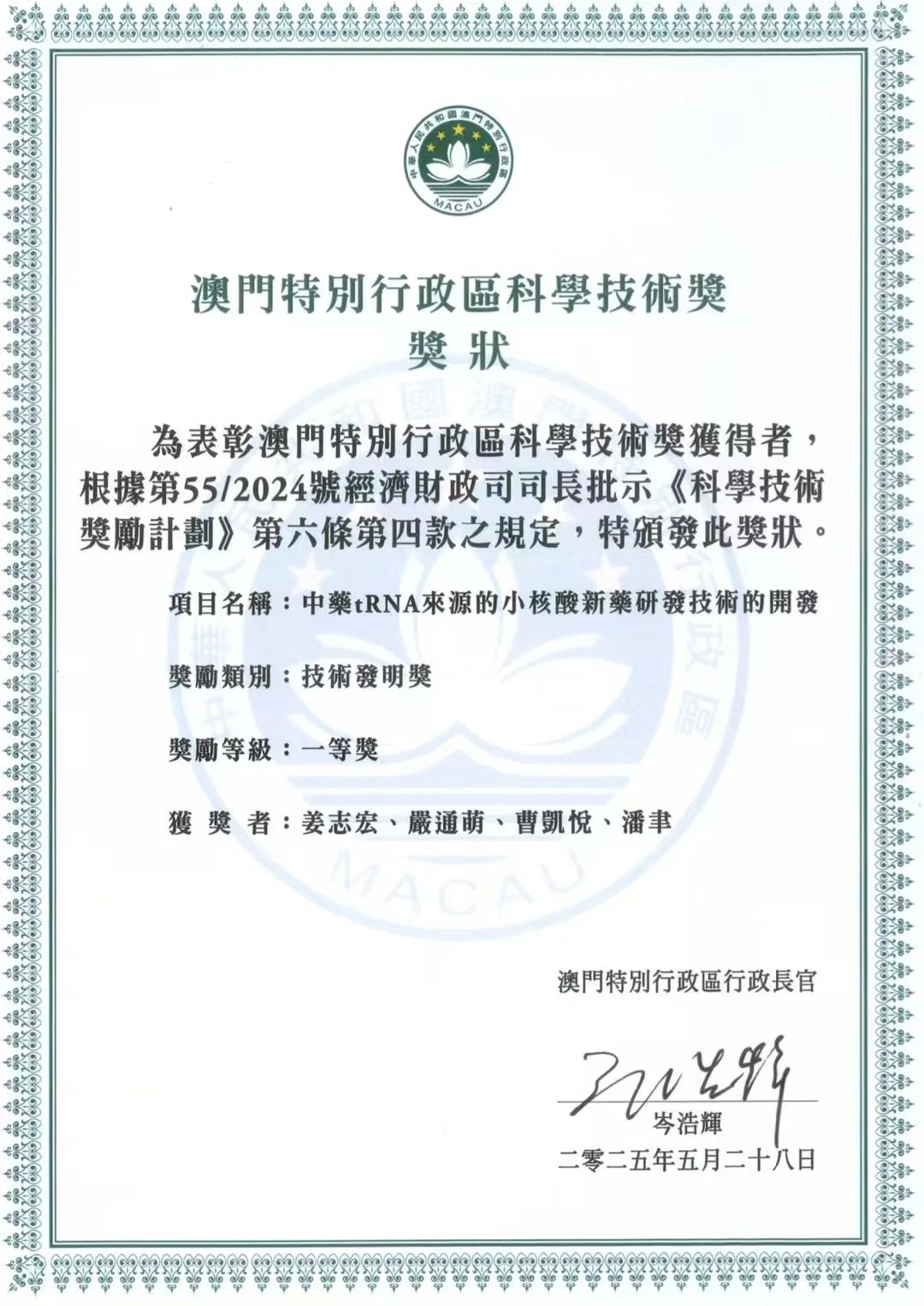 澳門科技最高殊榮 | “中藥小核酸項(xiàng)目”榮獲澳門科學(xué)技術(shù)發(fā)明一等獎(jiǎng)