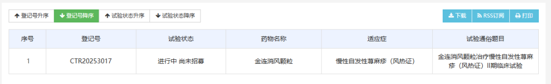 2025年7月29日,金連消風(fēng)顆粒已經(jīng)在國家藥物臨床試驗登記與信息公示平臺登記公示,代表金連消風(fēng)顆粒II期臨床試驗正式啟動,進(jìn)入受試者入組準(zhǔn)備階段(登記號:CTR20253017)。本次試驗采用多中心、隨機、雙盲、安慰劑平行對照設(shè)計,計劃招募240例慢性自發(fā)性蕁麻疹(風(fēng)熱證)患者,初步評估金連消風(fēng)顆粒治療風(fēng)熱證蕁麻疹的有效性和安全性。