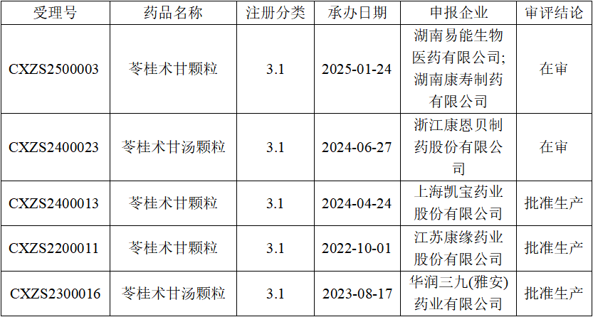 據(jù)CDE及NMPA官網(wǎng)顯示,目前苓桂術(shù)甘(湯)顆粒共有5家申報生產(chǎn),其中3家已獲批生產(chǎn),2家在審評中,匯總?cè)缦拢?/span>