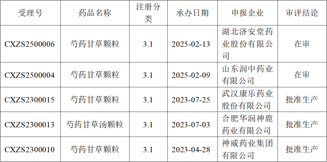 2025年2月,芍藥甘草顆粒有2家企業(yè)申報上市申請,分別是山東潤中藥業(yè)有限公司和湖北濟安堂藥業(yè)股份有限公司,目前均在審評審批中。