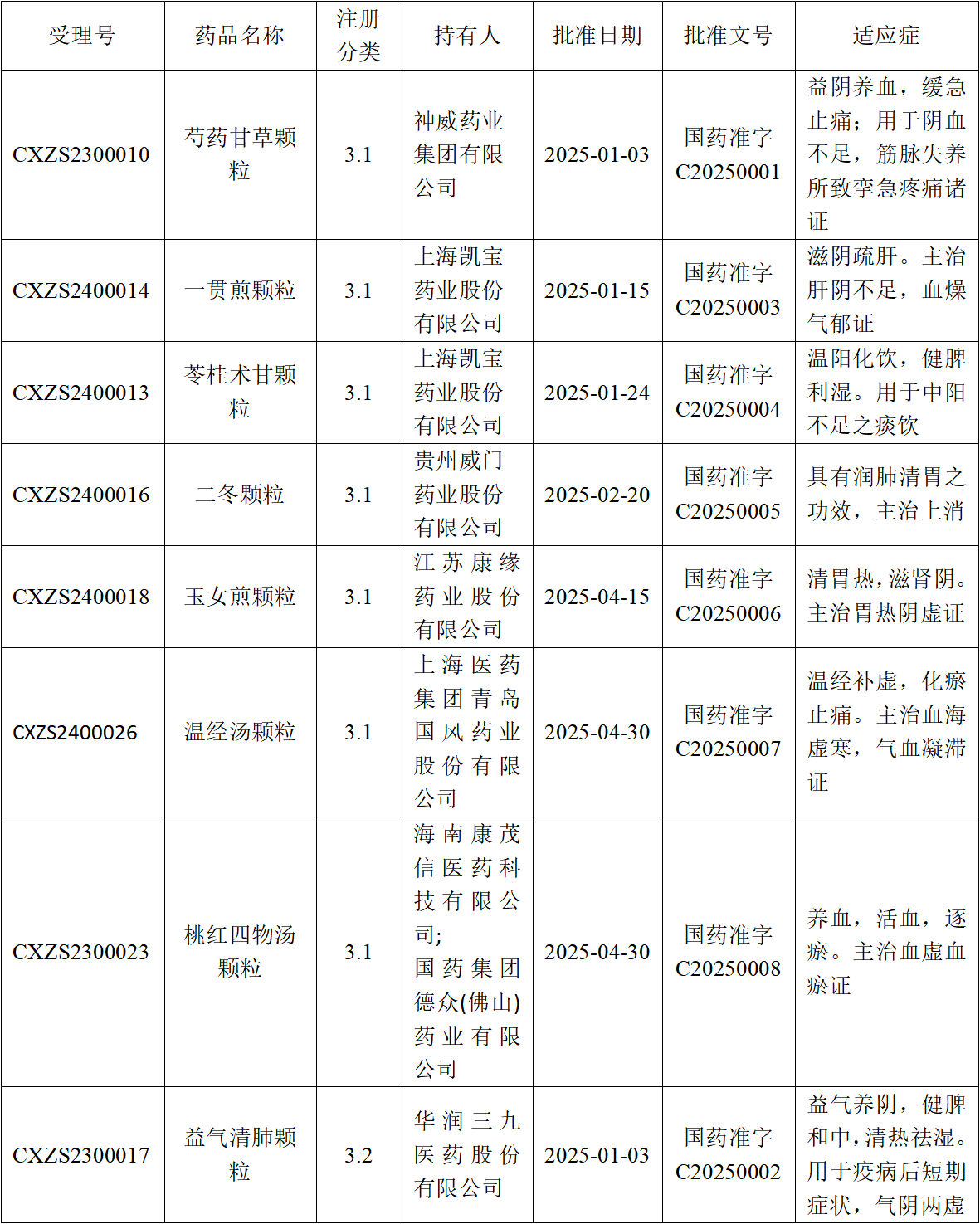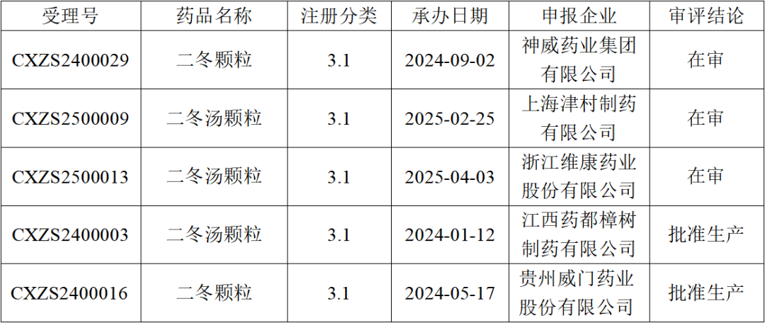 上海津村制藥有限公司及浙江維康藥業(yè)股份有限公司分別于2025年2月、4月申報二冬湯顆粒。據(jù)CDE官網(wǎng)及NMPA顯示,二冬(湯)顆粒按照中藥3.1類申報共有5家,其中2家已獲批生產(chǎn),分別為江西藥都樟樹制藥(首家獲批)和貴州威門藥業(yè),3家在審評中(神威藥業(yè)、上海津村制藥以及維康藥業(yè)),匯總?cè)缦拢?br />