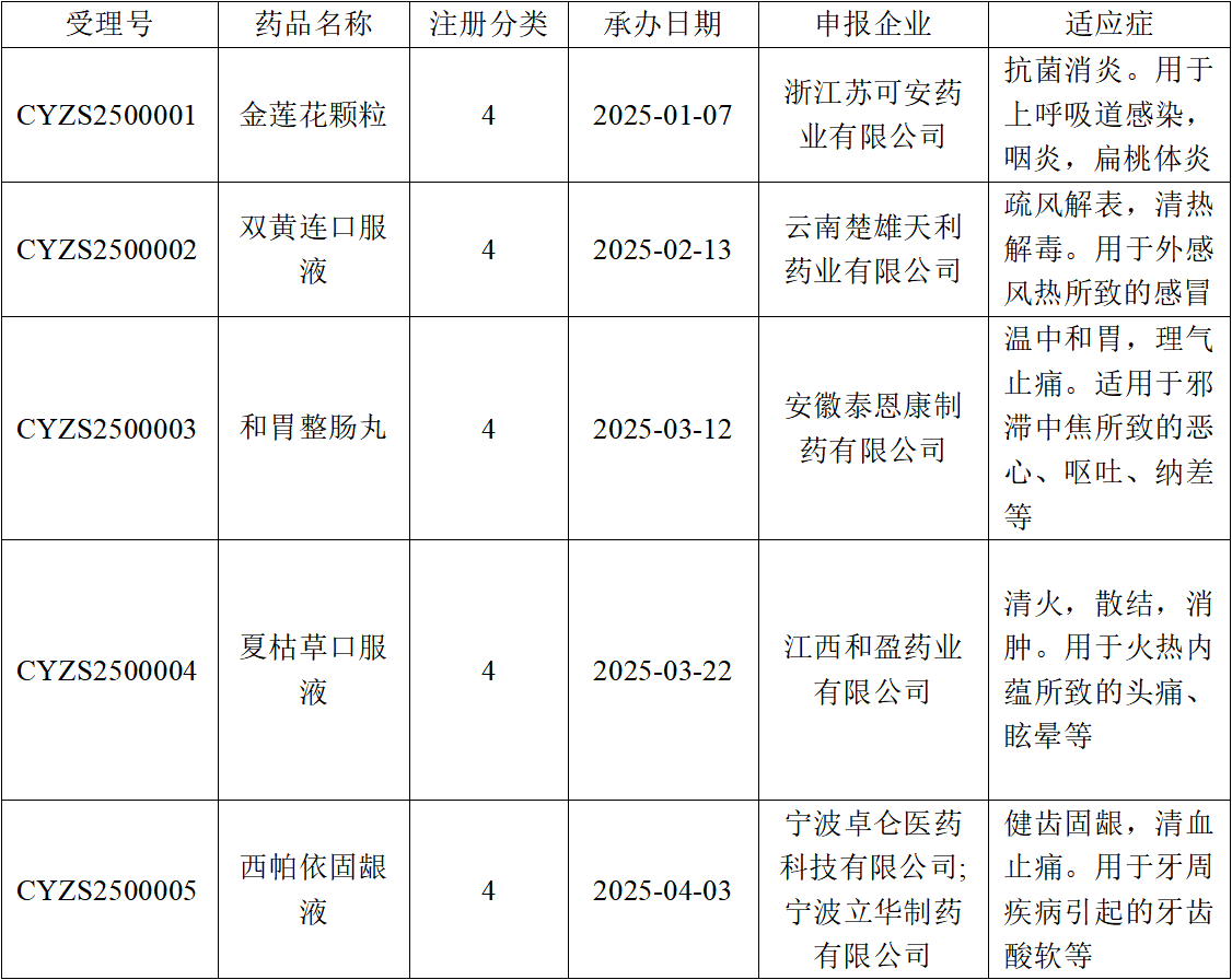 2025年1-4月無同名同方批準品種,3月,成都神鶴藥業(yè)有限責任公司申報上市的三七通舒膠囊(CYZS2400002)未獲批準。