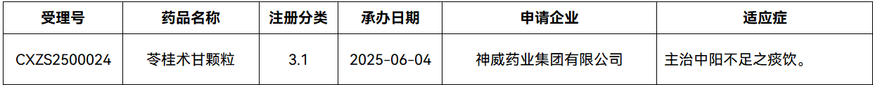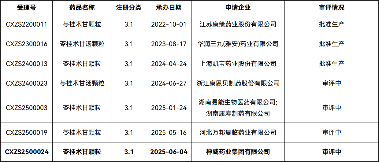 苓桂術(shù)甘顆粒由神威藥業(yè)集團(tuán)有限公司于2025年6月申報3.1類生產(chǎn),在審評中。