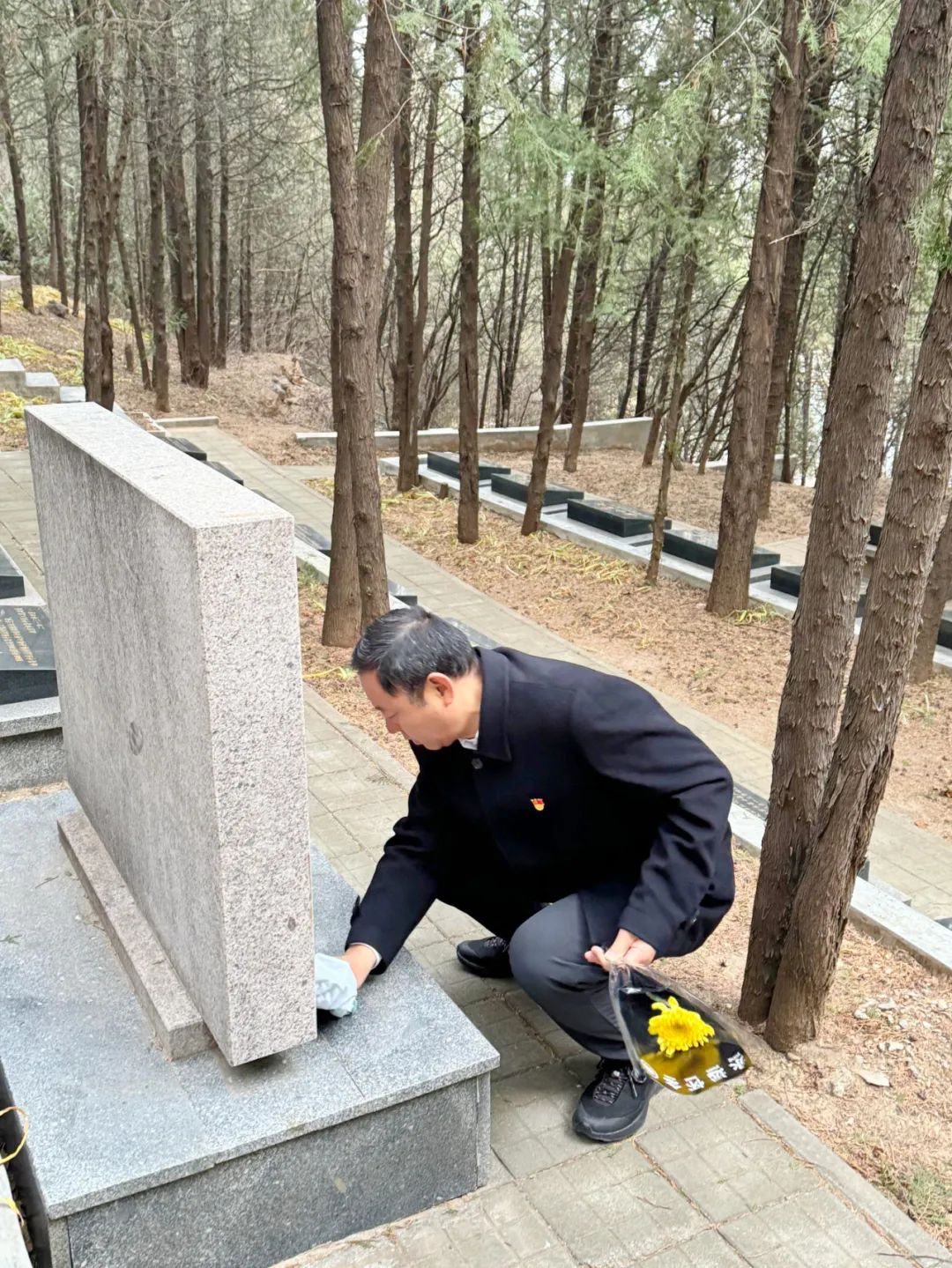 在烈士墓區(qū),書記手持濕布,小心翼翼地擦拭著墓碑,并帶領(lǐng)大家向烈士墓碑深深鞠躬,向革命先烈致以最崇高的敬意。大家逐一瞻仰墓碑上鐫刻著的革命烈士信息,每一座墓碑都記載著一段英雄的歷史,仿佛感受到一段段中華兒女為中國革命和建設(shè)事業(yè)前赴后繼、奮斗不息的壯烈故事。