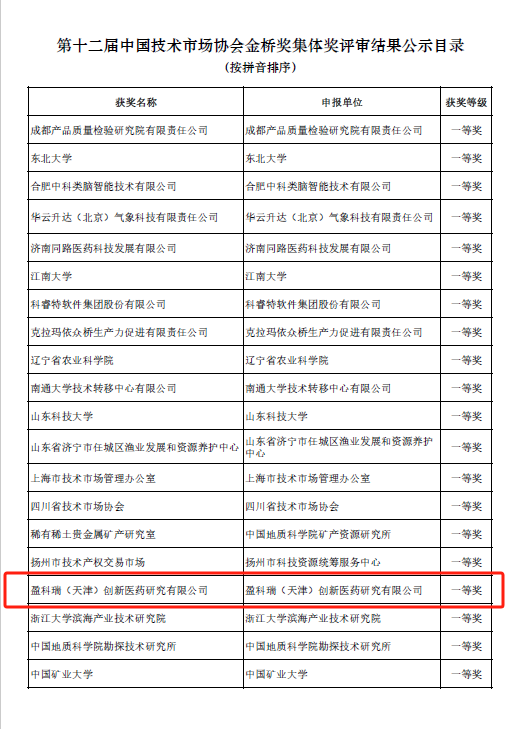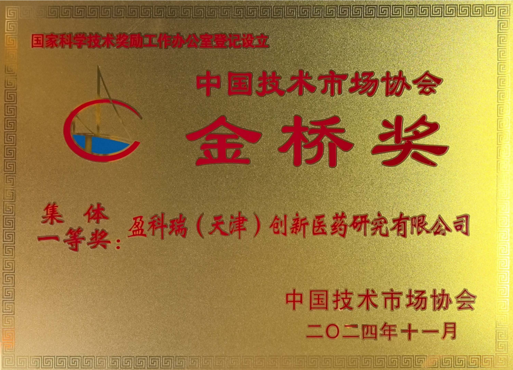 2024年12月12日至14日,全國技術(shù)市場領(lǐng)域最高獎項——第十二屆中國技術(shù)市場協(xié)會金橋獎(以下簡稱“金橋獎”) 表彰獎勵大會暨第十一屆中國科技服務(wù)業(yè)論壇在北京友誼賓館隆重舉行,盈科瑞(天津)創(chuàng)新醫(yī)藥研究有限公司(以下簡稱“盈科瑞天津公司”)榮獲金橋獎集體一等獎,該獎項的獲得是盈科瑞天津公司在科技成果轉(zhuǎn)化方面取得突出成績的證明。